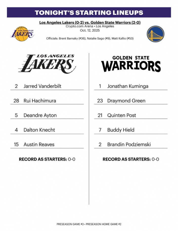 Lakers: Reeves, Knecter, Hachimura, Vanderbilt, Ayton;