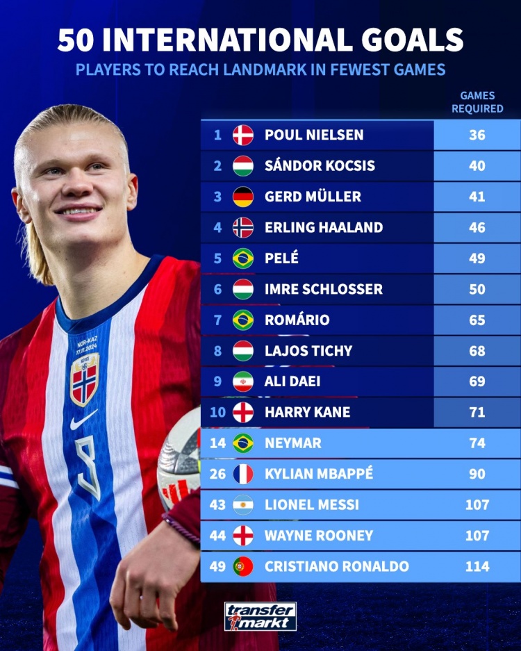 Trong trận đấu vòng loại World Cup tuần trước với Israel, Haaland đã lập một hat-trick, giúp anh trở thành cầu thủ ghi bàn thắng thứ 50 cho đội tuyển quốc gia nhanh thứ tư trong lịch sử. Để so sánh, Messi phải mất 107 trận để đạt được cột mốc này, trong khi Ronaldo mất 114 trận. Dezhuan liệt kê những cầu thủ thi đấu ít trận nhất để đạt 50 bàn thắng cho đội tuyển quốc gia.