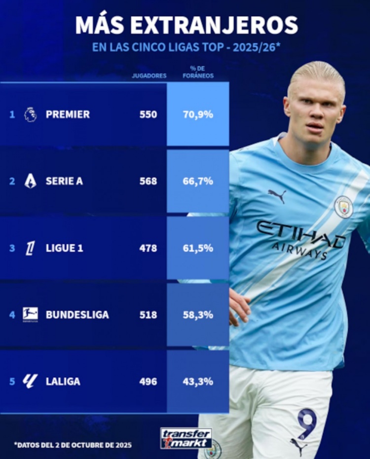Theo dữ liệu từ thị trường chuyển nhượng Đức, Premier League có tỷ lệ cầu thủ nước ngoài cao nhất trong 5 giải đấu lớn mùa này, trong khi La Liga có tỷ lệ thấp nhất.